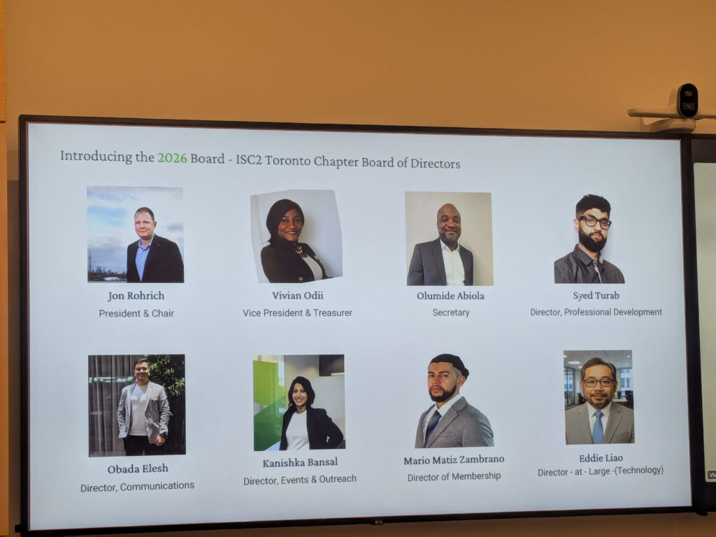 On Friday, November 21, 2025, the ISC2 Toronto Chapter convened its third Annual General Meeting at Manulife’s Toronto office. The meeting served as an opportunity for members to review the chapter’s considerable advancements in its financial health, operational efficiency, and community engagement. Our journey, which started as a post-pandemic recovery initiative, has resulted in a robust and diverse organization cherished by its members. The event was hosted at Manulife and attracted more than 30+ cybersecurity professionals from across the GTA, allowing us to formally celebrate our growth, recognize key volunteers, and establish the strategic framework for the coming year.